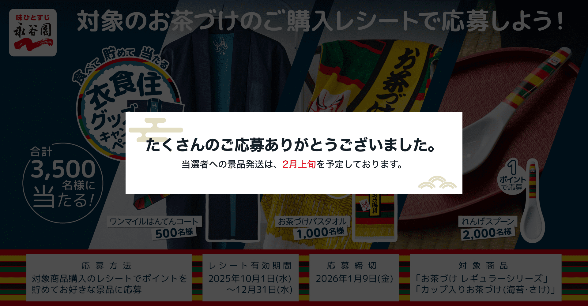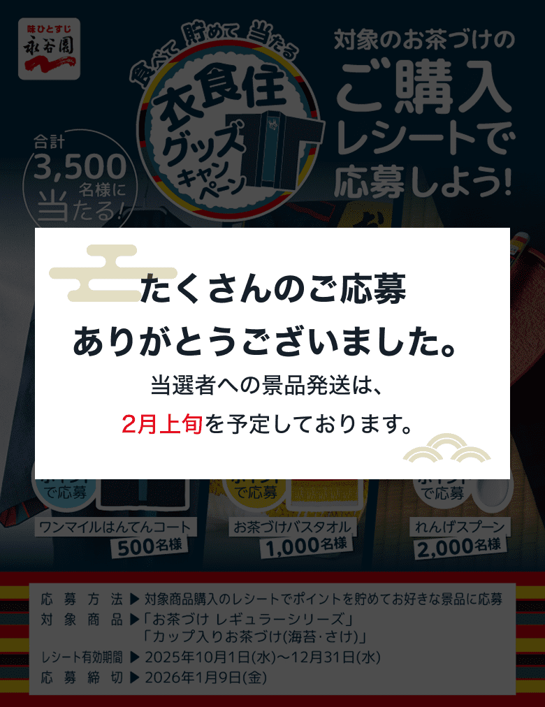 ※本キャンペーンに当選された方は、同時期に永谷園が実施中の同一商品を対象とした他のキャンペーンにはご当選できない場合がございます。